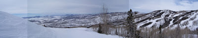 I've arrived in Colorado by way of an air conveyance called an airplane where I was forced to sit in seats only slightly larger then by butt. Sadly due to my larger then normal shoulder girth (read, I'm a fat man) I was treated to several pummelings by people walking up and down the aisles as well as a giant metal sled containing drinks and snacks (for 5.00). I now feel I can safely say I know what a sardine feels like. After a 30 minute drive by coach to the town of steamboat, I checked into my room, which had a fantastic view of the surrounding area (see pic below). My companions were due to arrive later that evening due to a lack of a flight crew in the Philadelphia airport (how the hell do you lose your flight crew?), so I took the local shuttle to the markets and purchased some food for the evening. I had myself some of the local purveyance and sat on the porch to enjoy the view till my friends arrived. It was a good day!